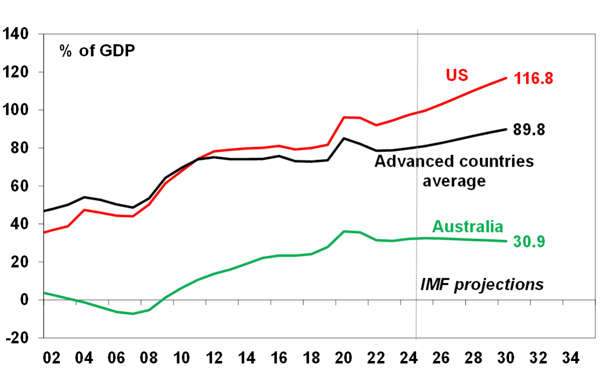 - Bigger government and more public debt – more defence spending and government involvement in economies, eg in onshoring, mean more public spending, bigger budget deficits and ever higher public debt – at a time when its already high. The latter is particularly evident in the US with Trump pushing for a $500bn (or 42%) defence budget boost when the US budget deficit is running around 6.5% of GDP despite low unemployment suggesting it should be in surplus.